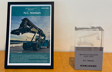 At the international dealer conference at Konecranes LiftTrucks, N.C. Nielsen is awarded Best Service Sales EU (2023–2024).
