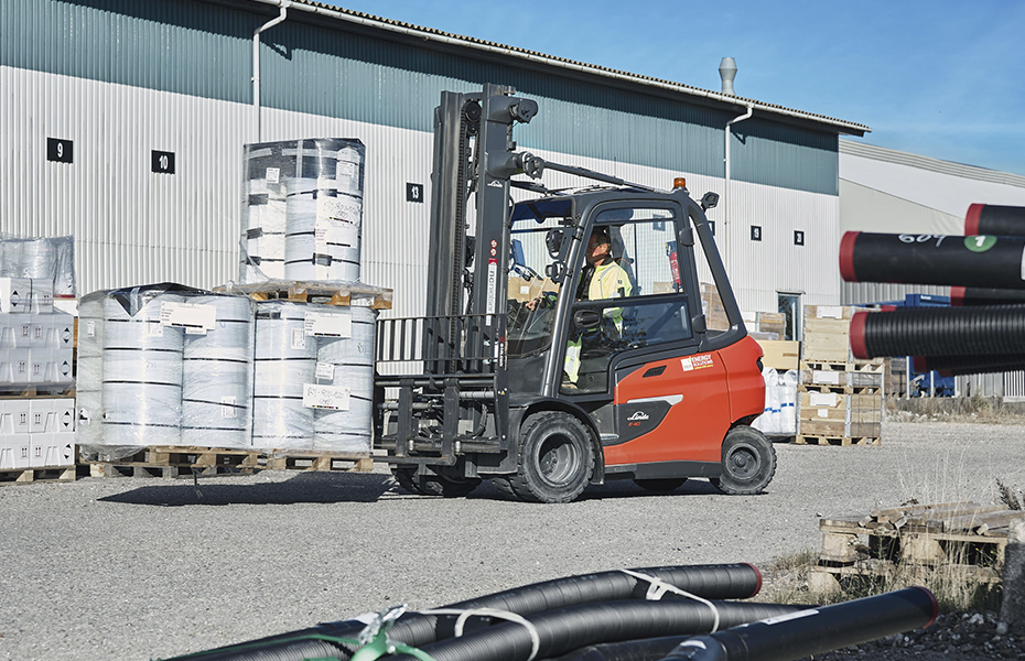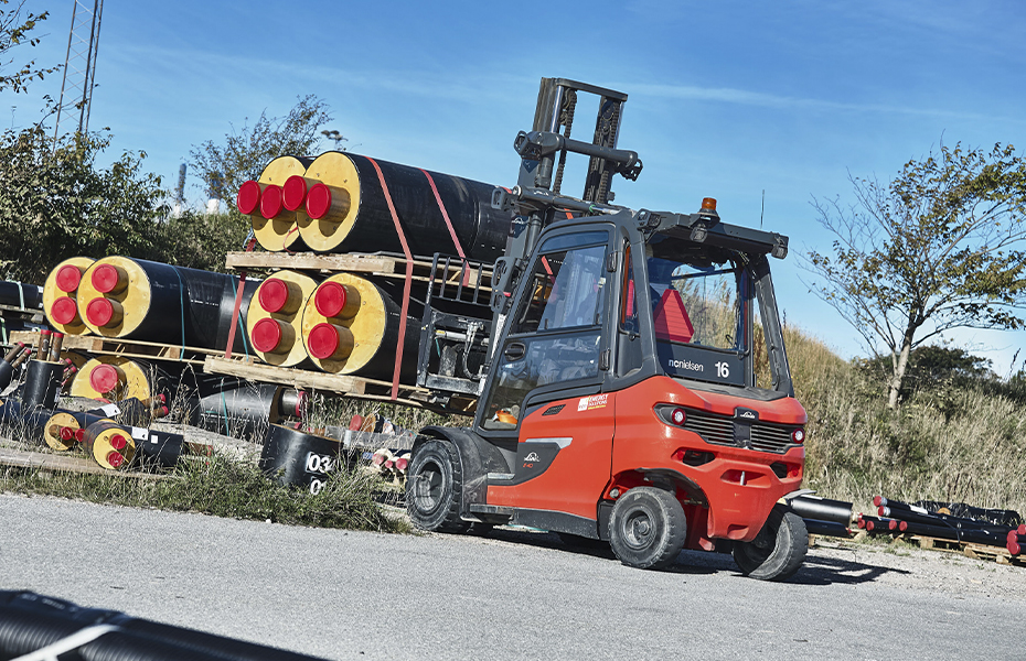 The new Linde E40 electric trucks are in operation from early morning until late afternoon. Each year, more than 7,500 lorries pass through the factory gates to be either loaded or unloaded with district heating pipes, fittings and other goods. At the Løgstør facility, up to 31,295,000 tonnes of goods are handled annually — a task that naturally requires robust, efficient and high-performance logistics equipment.