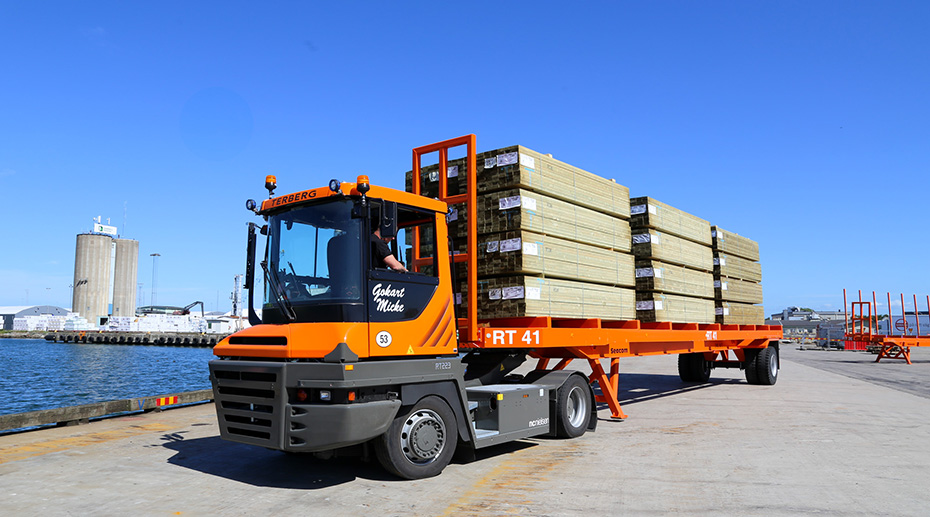 In the procurement process it was emphasised that the terminal tractors must have four‑wheel drive, based on past experience. The result was the Terberg RT223, a machine combining strong tractive power, stability and good fuel efficiency. With its robust transmission and permanent four‑wheel drive, it is capable of pulling heavily loaded timber wagons.