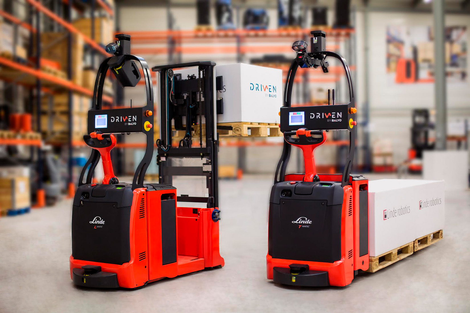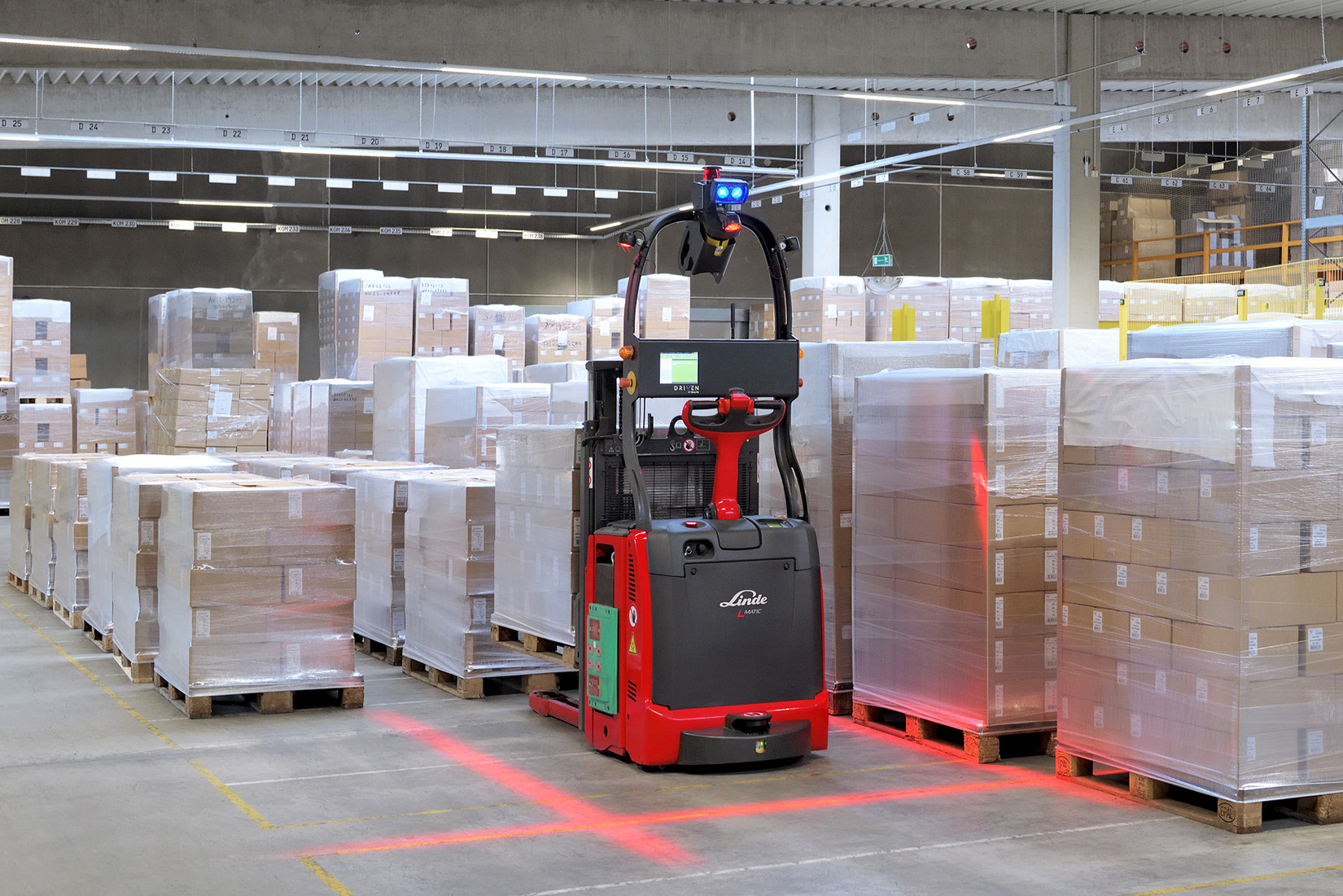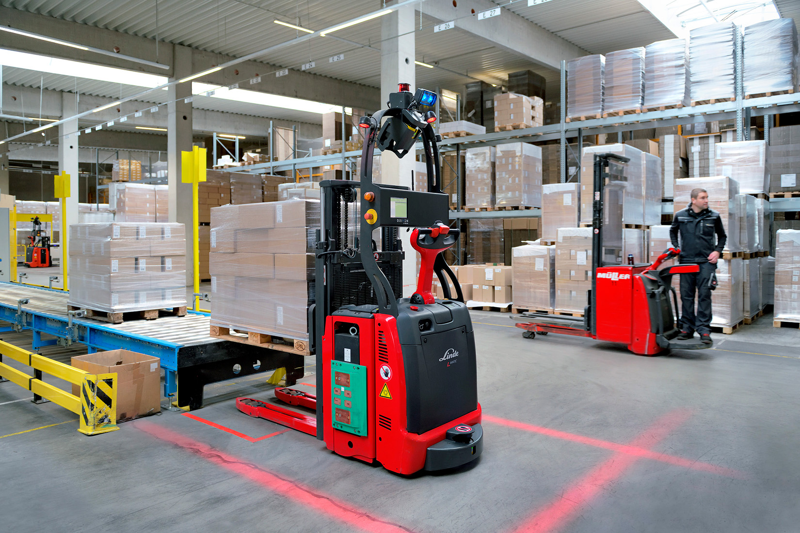 The Linde Material Handling L-MATIC pallet stacker is suitable for storage or removals at low level. It tackles loads of up to 1,200 kg and lift heights up to 1.9 meters. Thanks to infrastructure free natural feature navigation, the L-MATIC can be used flexibly as an individual truck or as part of an automated fleet.
