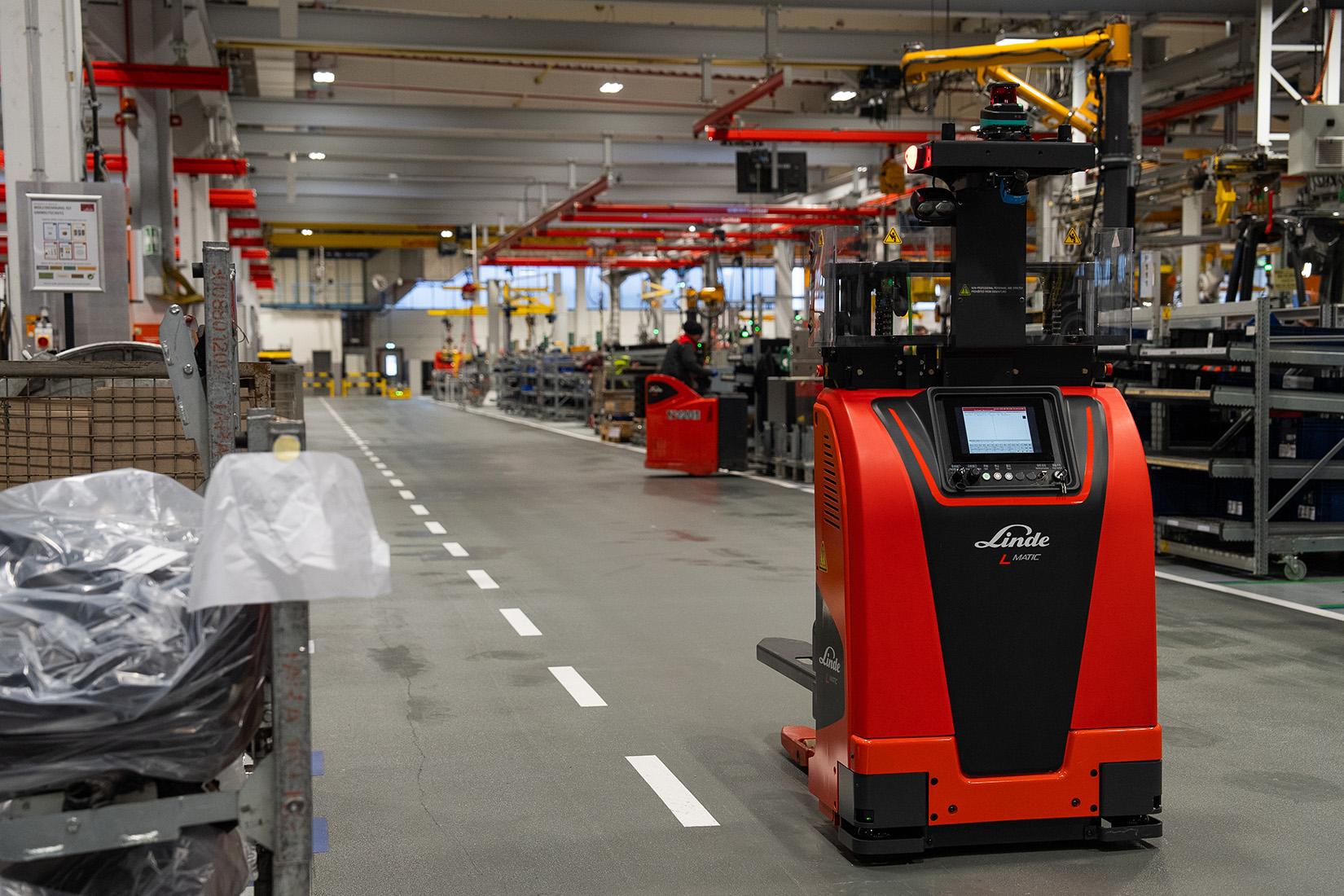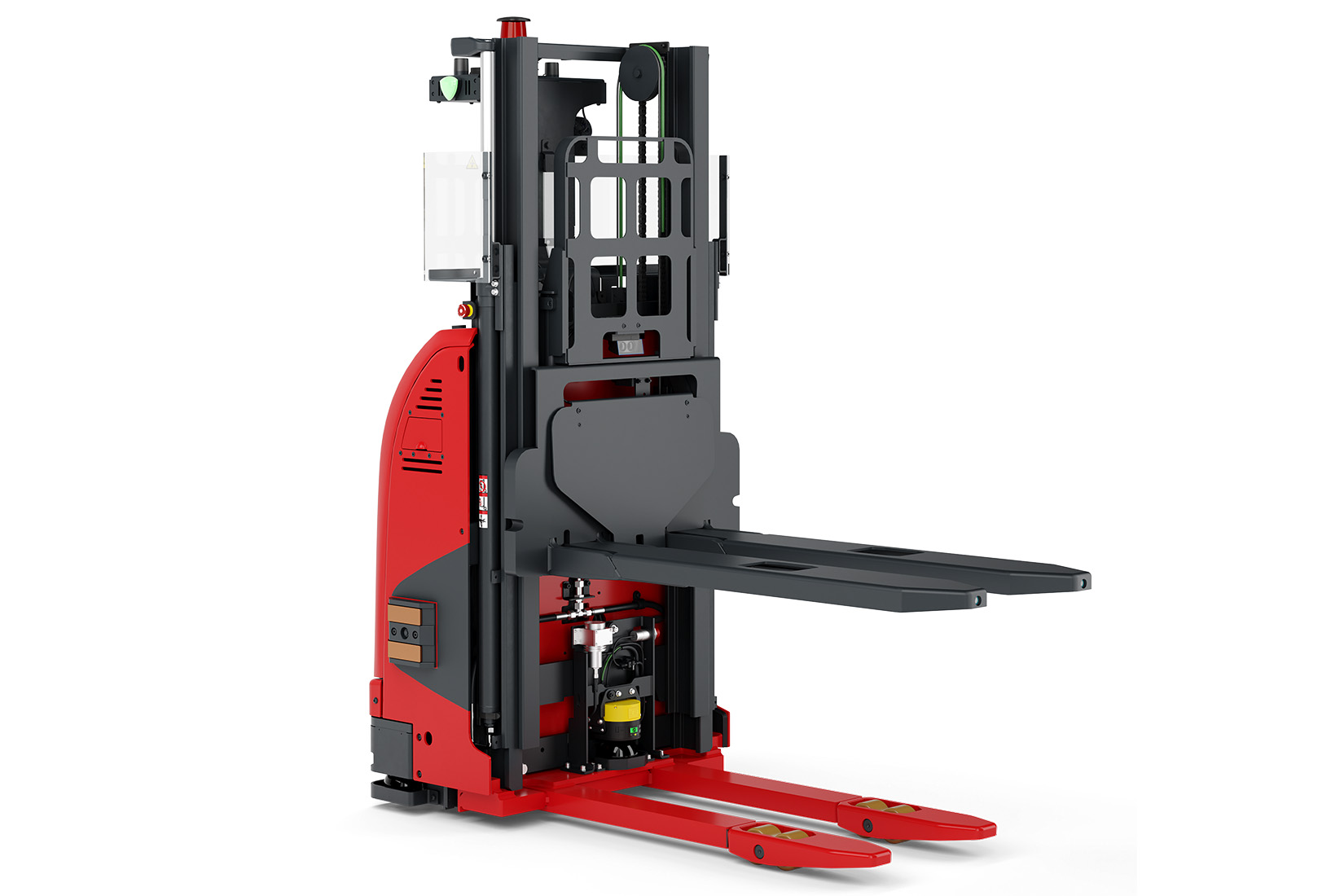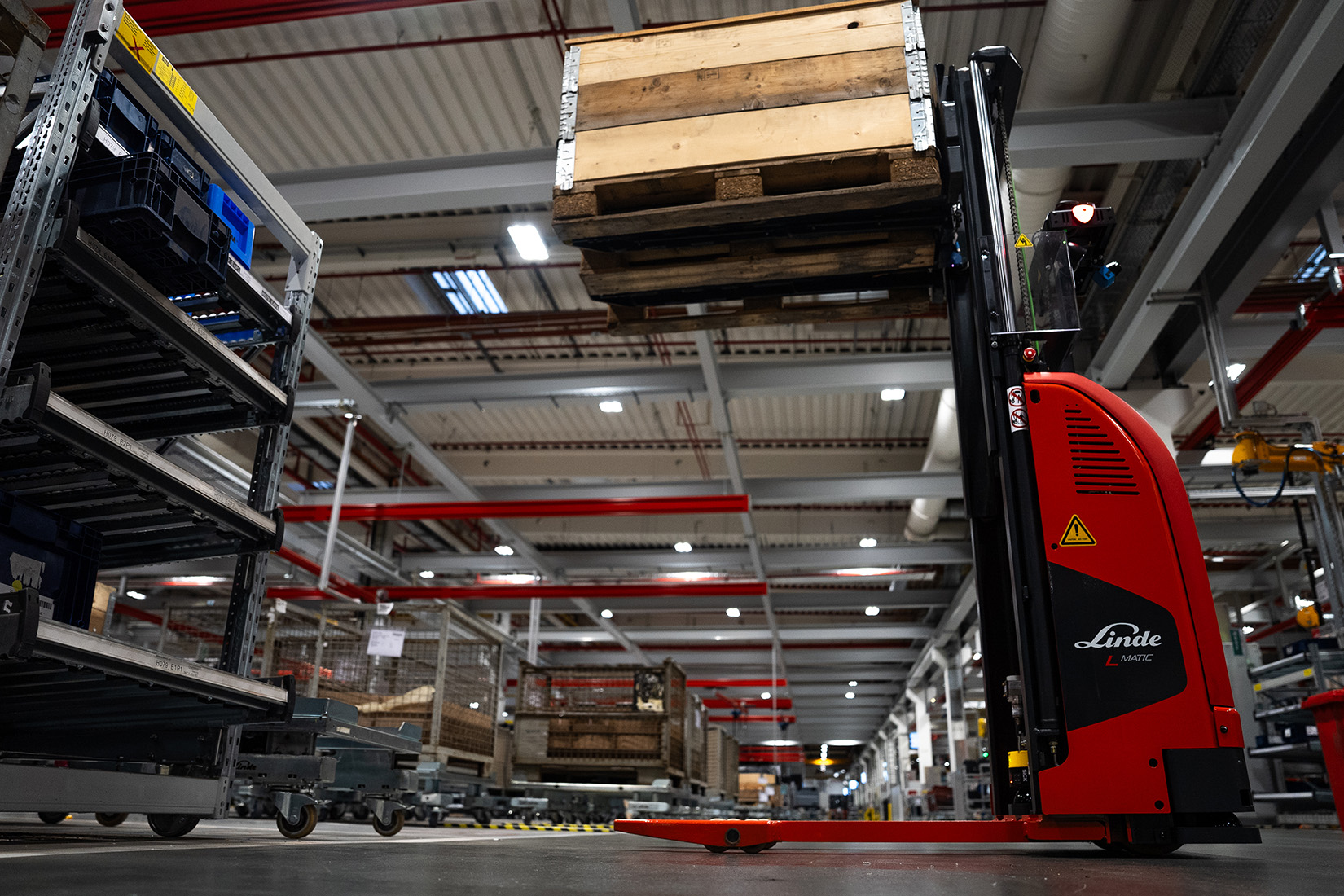 The automated L-MATIC core pallet stacker was specially developed for use in tight spaces. With a load capacity of 1.2 metric tons and a maximum lift height of 1.84 meters (storage height: 1.78 meters), this pallet stacker is suitable for standard applications including ground transport, conveyor belt use, and storage and retrieval at low levels.