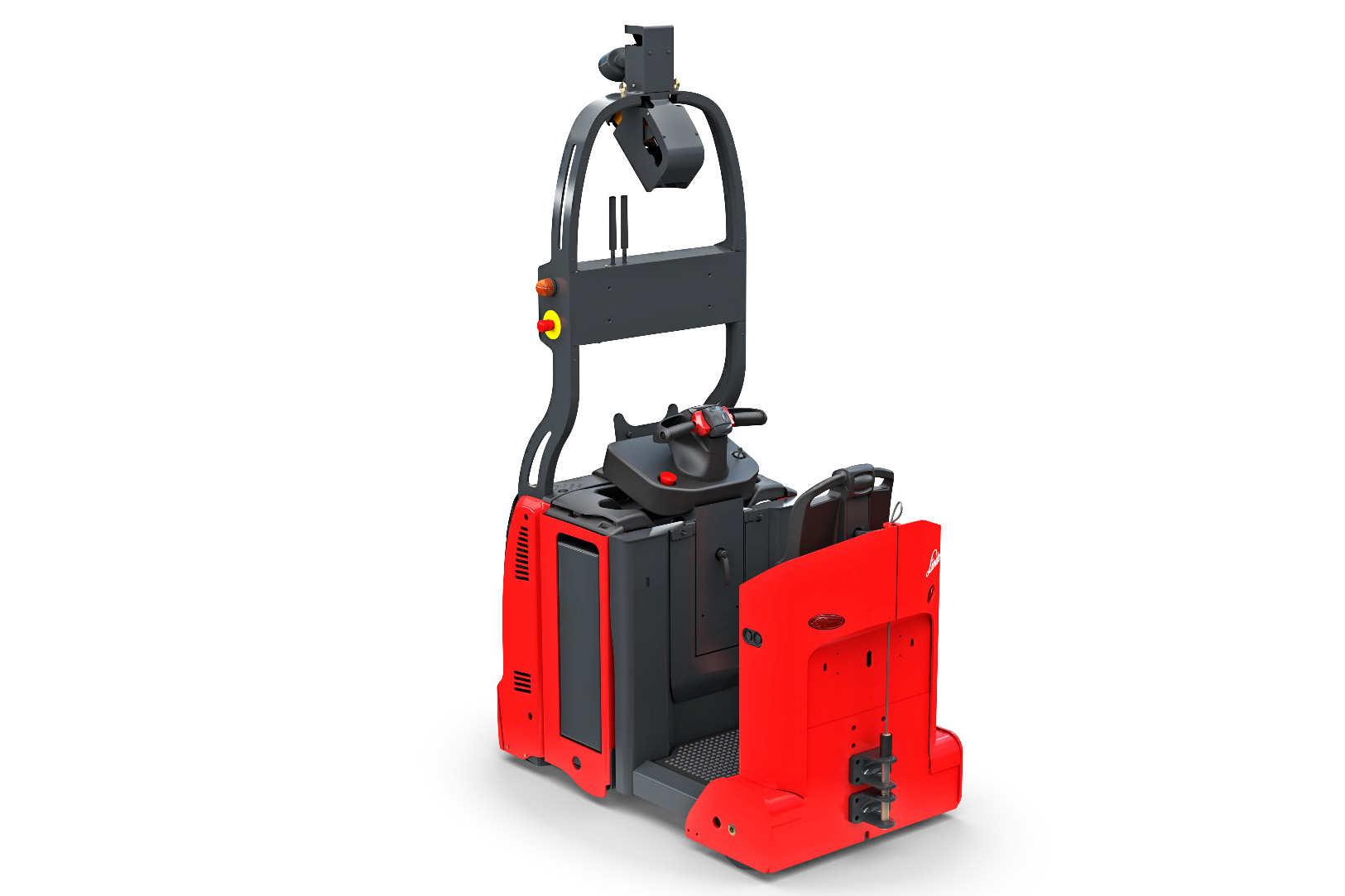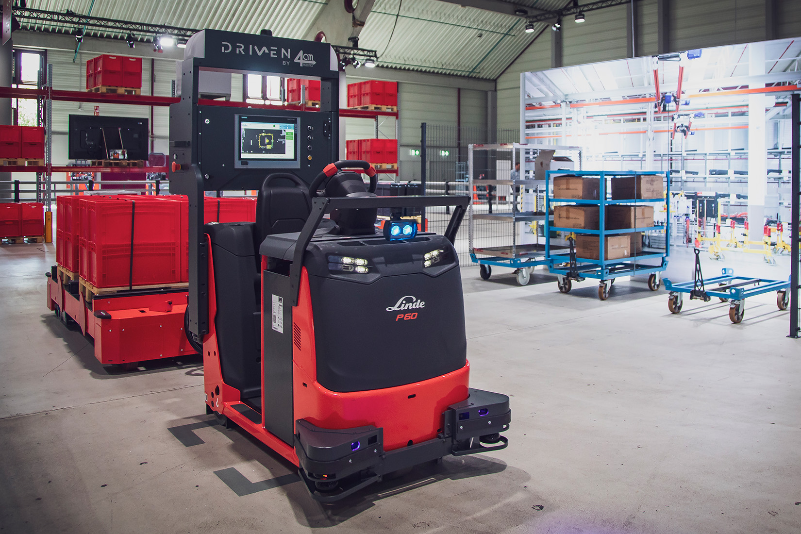 The autonomous Linde P-MATIC electric tow tractor with operator platform is designed for load transfers in work areas with restricted space. It can move towing loads of between 3000 and 5000 kilograms.