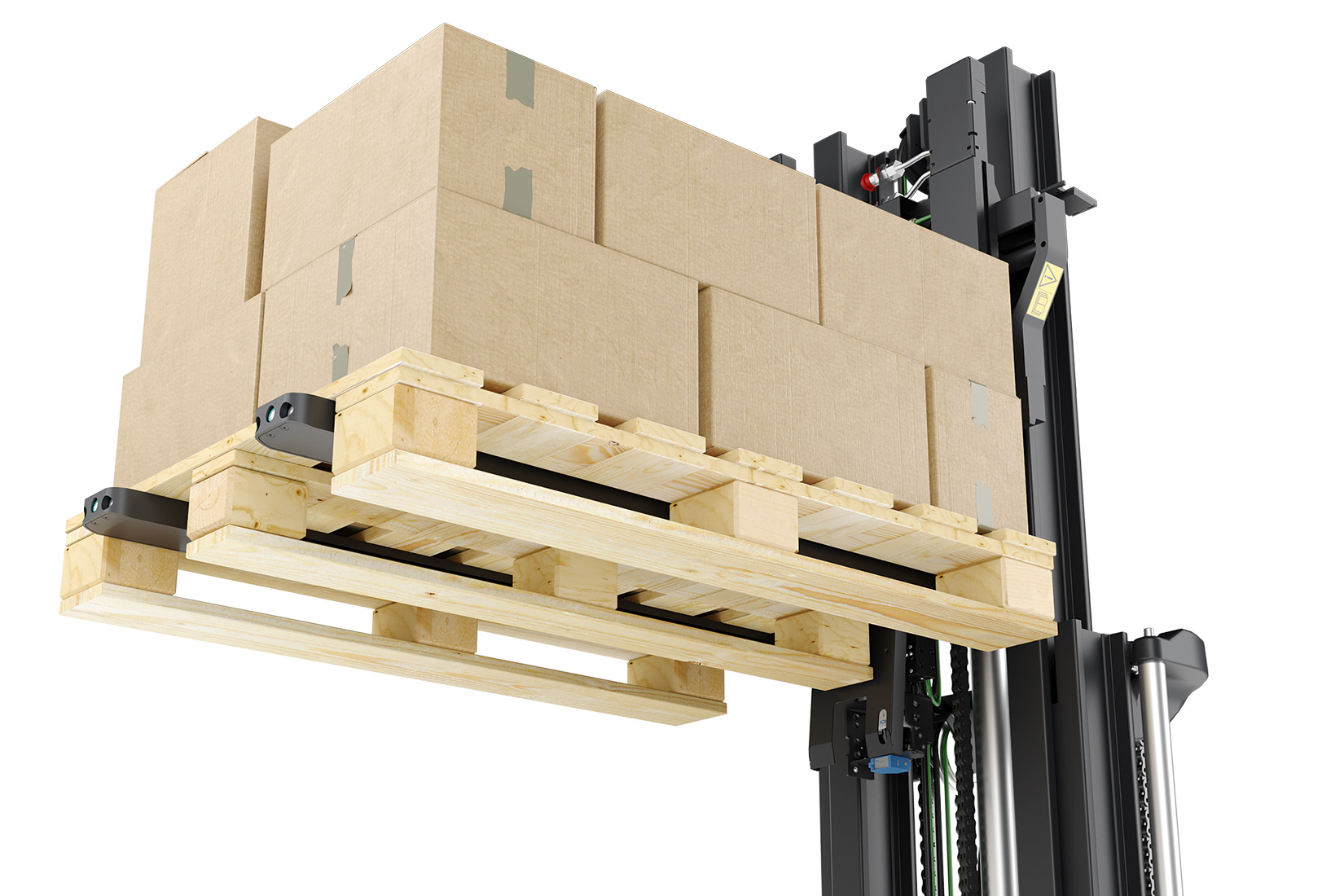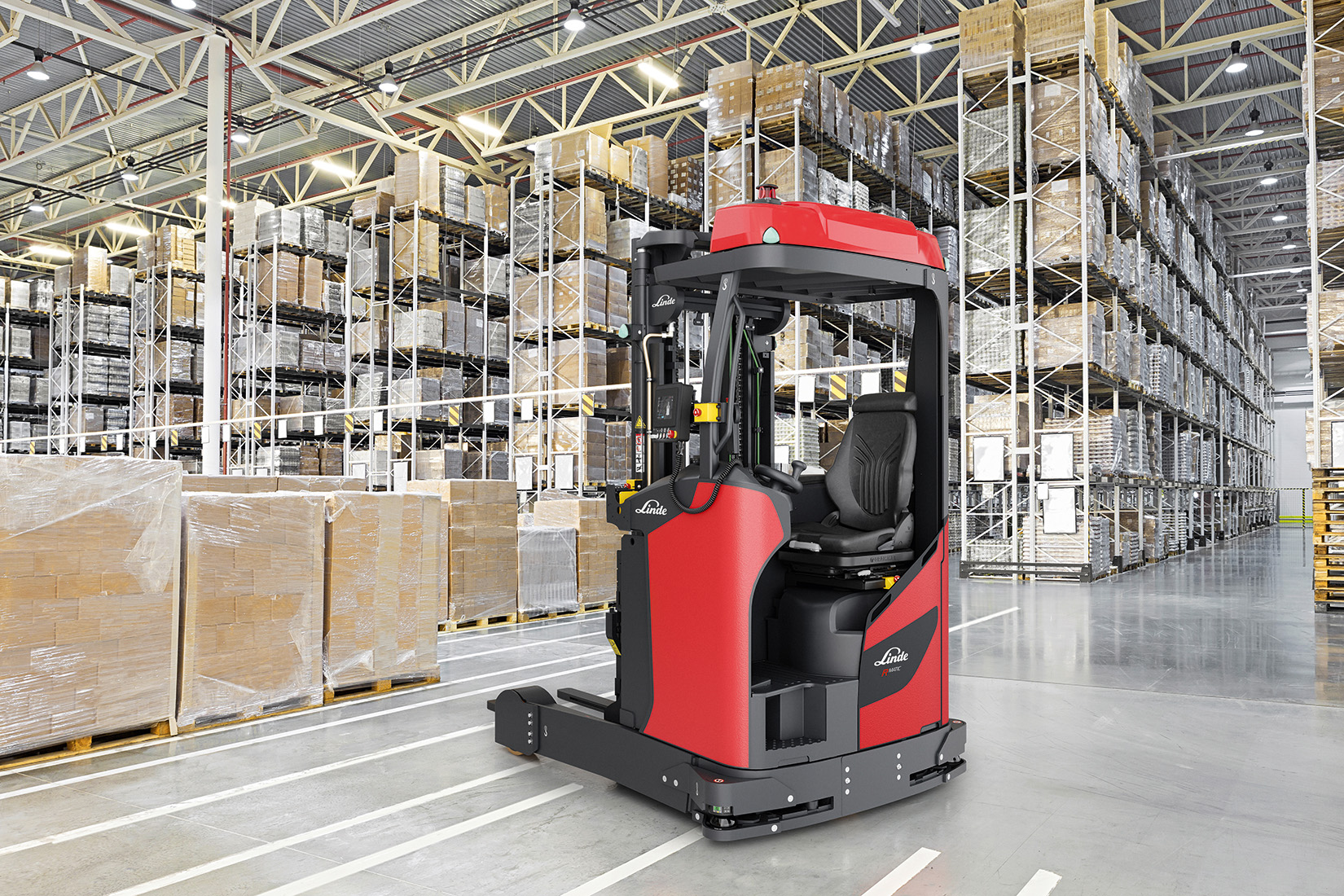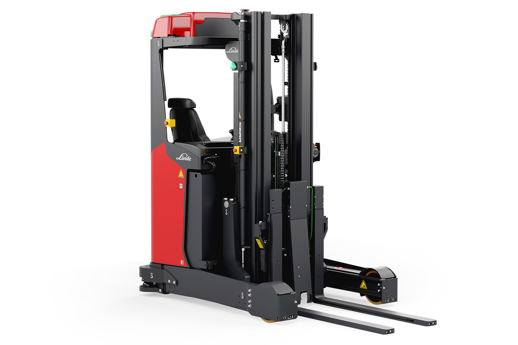 The automated R-MATIC k reach truck is the ideal solution for efficiently transporting as well as precisely storing or retrieving goods weighing up to 2,300 kilograms at heights of up to 10 meters. The R-MATIC k is a reliable companion in incoming and outgoing goods, for storage and replenishment processes in high-rack warehouses, as well as for transporting and delivering goods to transfer stations between conveyor belts and packing stations.
